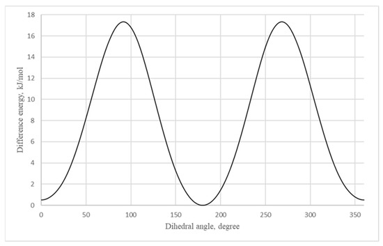 Figure 5), the energy of the most stable isomer was taken as zero, and the zero value of the dihedral angle corresponds to the structure of the molecule, as shown in