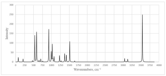 −1 peaks refer to stretching vibrations of hydrogen atoms in the vinyl fragment. It should be noted that we used a scaling multiplier of 0.9688 for the entire range of wave numbers, and in the region of the small wave numbers, the theoretical values are somewhat underestimated compared to the experimental ones. Peaks at about 1000–1300 cm