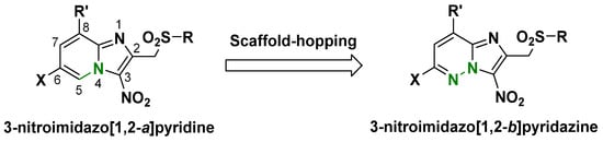 As part of our ongoing medicinal chemistry work to improve Hit A properties, a scaffold-hopping strategy on the 3-nitroimidazo[1,2-a]pyridine core was implemented for structure–activity relationship purposes. This scaffold-hopping approach allowed the discovery of structurally new compounds, from known active molecules, by modification of their core [10]. By replacing the carbon atom at position 5 of the 3-nitroimidazo[1,2-a]pyridine moiety with a nitrogen atom, a new 3-nitroimidazo[1,2-b]pyridazine moiety was obtained (Figure 1).