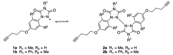 Urazolyl radicals 1a and 1b in equilibrium, in a solution with N-N dimers 2a and 2b.