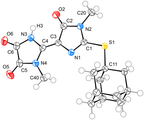 However, during the isolation of main reaction product 3, we found a small amount (3%) of an unidentified by-product, which was insoluble in acetone. Separated by the filtration of the acetone solution, it was then dissolved in ethanol and left for slow crystallization. The resulting crystals were of good quality for a single-crystal X-ray diffraction study. The analysis (see supplementary) showed that the by-product was (Z)-2′-((adamantan-1-yl)thio)-1,1′-dimethyl-2′,3′-dihydro-[2,4′-biimidazolylidene]-4,5,5′(1H,1′H,3H)-trione (5, Scheme 2, Figure 2).