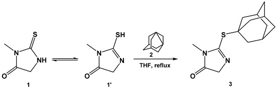 It is known that 2-thiohydanoin and its 3-substituted derivatives undergo a tautomeric transformation, as is shown in Scheme 1 [29]. Thus, our study intended to establish which form of 3-methyl-2-thiohydanoin reacts with 1,3-DHA (2). The reaction was carried out in THF under reflux for 8 h. We discovered that the main product of the reaction is 2-((adamantan-1-yl)thio)-3-methyl-3,5-dihydro-4H-imidazol-4-one (3), which corresponds to the involvement of the S–H bond of 1’, instead of the N–H of 1.