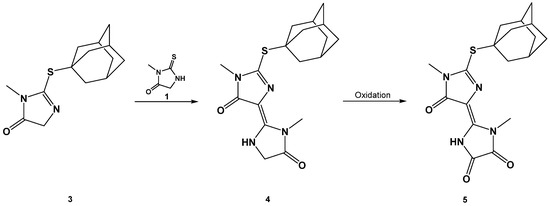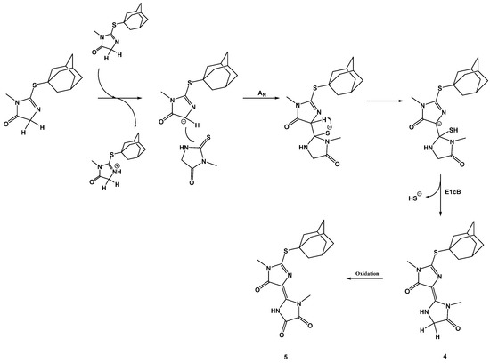 Putative route of formation of the (Z)-2′-((adamantan-1-yl)thio)-1,1′-dimethyl-2′,3′-dihydro-[2,4′-biimidazolylidene]-4,5,5′(1H,1′H,3H)-trione (5).