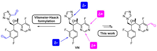 Next, VN-CH2OH was oxidized to VN-CHO in the presence of activated manganese dioxide as an oxidizing agent (Scheme 2). Using an excess of MnO2, in ethyl acetate, at reflux for 4 h, VN-CHO was obtained in 70% yield. It is noteworthy that this methodology is regioselective as the hydroxymethylation step occurs predominantly at C-4 of the pyrimidine ring of VN and consequently, only one regioisomer was obtained. On the other hand, if a standard Vilsmeier–Haack formylation procedure was performed directly in the VN, the desired VN-CHO might not be obtained since the preferred sites for formylation would be the electron-rich 1,2,4-triazole and difluorophenyl moieties (Figure 3).