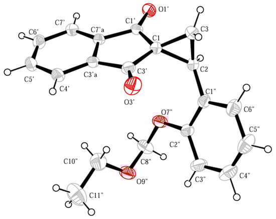 1H NMR spectrum of compound 4 contains three doublets of doublets in the upfield region. These signals correspond to protons of the three-membered ring. Geminal coupling constant 2J for CH2 protons is 4.2 Hz, which is typical (from 4 to 5 Hz) for the methylene group of cyclopropane. The structure of indanedione-derived cyclopropane 4 was unambiguously confirmed by single-crystal X-ray analysis (Figure 1). This structure closely matches the structures of the related DA cyclopropane without ortho-substituent []. The small difference is in some rotation of the phenyl group, providing the most efficient interaction of ether oxygen with the closest carbonyl group. This interaction is possibly responsible for some shortening of the C(1)–C(2) bond between the atoms linked to donor and acceptor substituents in 4 (1.542 Å) compared to the analogue without the 2-ethoxymethoxy group (1.561 Å, []). NMR and IR spectral data for compound 4 resemble the corresponding data for other 1,3-indanedione-derived DA cyclopropanes [,,]. For copies of spectra, see Supplementary Materials.