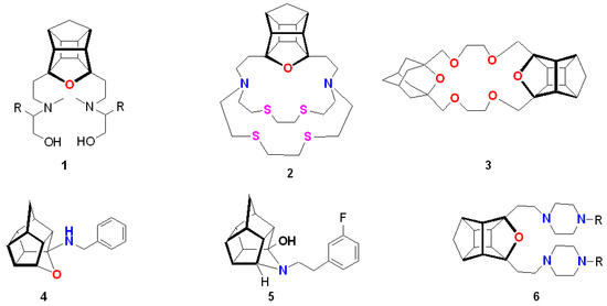 Heterocycles have attracted interest from the scientific community because of their biological activities against various diseases [1]. They are considered promising candidates that are available from natural sources, show applications in medicinal chemistry and pharmaceutics, play a prominent role in the synthesis of agrochemicals, and act as key synthons for the design of pharmacophores in modern drug chemistry [2]. Amongst the known heterocyclic compounds, cage-containing heterocyclic scaffolds are found in applications of bioorganic chemistry, material science, and supramolecular chemistry [3,4,5]. Cage polycycles bearing heteroatoms in their molecular architecture act as ligands and are also suitable for chelation with metal ions [6]. These are also considered core frameworks for energetic and photonic/electronic materials [7]. Furthermore, functionalized hetero cages exhibit medicinal properties and act as valuable candidates for pharmaceutical applications [8,9]. Additionally, some of the cage scaffolds (1–6) depicted in Figure 1 were constructed by employing novel synthetic approaches. These heterocyclic cages are used as chiral ligands (1) [10] and supramolecules (2–3) [11,12], and some of those (4–6) display interesting activities against tuberculosis, anti-Parkinson activity, and neurodegenerative diseases [13,14,15].