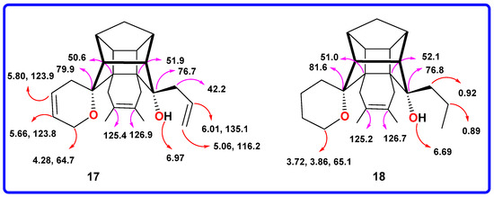 The 1H NMR spectrum of the cage spiro-pyran derivative 17 displayed the presence of one singlet (-OH proton) at δ 6.96 (1H), which indicates the proton of alcohol, one doublet at δ 5.66 (1H), and three multiplets at δ 5.06 (2H), δ 5.80 (1H), and δ 6.01 (1H), which represents the olefinic proton of allylic carbon and the spiro-pyran ring. In addition, the 13C NMR spectrum of 17 shows the four characteristic peaks (olefinic carbon) at δ 135.1, 123.9, 123.8, and 116.2 ppm of allyl carbon, and the spiro-pyran ring system represents the –CH and –CH2 carbon (Figure 2). In the 1H NMR spectrum of compound 18, the one singlet (-OH proton) at δ 6.96 (1H) indicates the proton of alcohol, and the multiplet at δ 0.91 (4H) represents two –CH2 carbons adjacent to the quaternary carbon of -OH. In addition, the 13C NMR spectrum of compound 18 also shows two peaks at δ 81.6 and 76.8 that represent the quaternary carbon and at δ 65.1 that represent the -CH2 carbon adjacent to the oxygen in the spiro-pyrane ring. In the spectra of cage spiro-pyran derivative 18, it shows the two olefinic peaks of the cyclohexane ring, and the other peaks of the allyl carbon and spiro-pyran rings are missing, which shows the reduction of double bonds. So, we clearly identified cage spiro-pyran derivative 17 and hydrogenated spiro-pyrane product 18 based on chemical shift values (1H and 13C). The NMR spectra of all of these are provided in the Supplementary Materials.