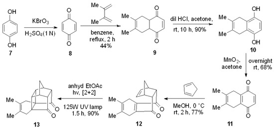Subsequent oxidation of the hydroquinone 10 in the presence of MnO2 gave the quinone derivative 11 (Scheme 1) [15]. Having prepared the DA precursor 11, cage dione 13 was prepared via [4+2] cycloaddition and intramolecular [2+2] photocycloaddition. In this context, cycloaddition of the quinone 11 was accomplished by reacting with a freshly cracked 1,3-cyclopentadiene at 0 °C, delivering the desired cycloadduct 12 and furthering the DA adduct 12 and undergoing [2+2] photocycloaddition through UV irradiation with a 125 W-homemade lamp, producing the hexacyclic cage dione 13 (Scheme 1). The structure of cage dione 13 was confirmed by 1H NMR and 13C NMR data.