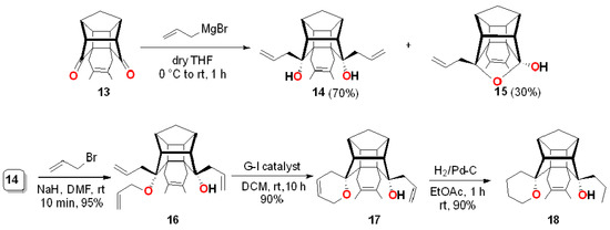 In view of the literature reports and valuable applications of cage polycycles, we are actively involved in developing new methods and simple synthetic strategies for cage frameworks. During the last two decades, we have demonstrated various new synthetic routes to diverse and functionalized cage molecules by employing cycloaddition and olefin metathesis protocols as key steps [16]. Several reports are available for the synthesis of oxa-cage molecules in the literature [17]. Some of these strategies to create hetero-cages rely on tandem cyclization, transannular cyclization, base-promoted rearrangement, dehydration of diols, intramolecular, and alkene-oxirane photocycloaddition [17]. As part of our ongoing research focused on designing intricate molecules based on metathesis, here we conceived a ring-closing metathesis (RCM) approach to construct functionalized hetero-cage systems [18,19,20]. In this regard, we identified cage dione 13 [21,22] as a useful starting material for the design of a target compound such as 17.