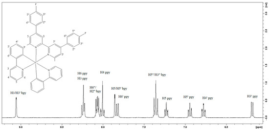 The 1H-NMR spectrum of 1 was recorded in acetone-d6 and is depicted in Figure 1. It consists of a set of well-separated sharp signals, indicative of the complex symmetry and integrity in the solution. 1H assignments, as well as complexation-induced changes (Δδ) in chemical shifts, are listed in Table 1. It should be noted that the ppy/L column values correspond to 1H chemical shifts in the complex [Ir(ppy)2(CH3CN)2]PF6 (which was synthesized using the method reported in [17]) and the studied diimine. From the data cited in Table 1, it is evident that both ligands interact strongly with the metal center [18,19]. Interestingly, the presence of the ancillary ligand induces further changes to proton chemical shifts of the already metal bound ppy in Ir(ppy)2 moiety.
