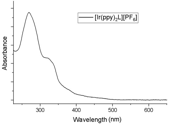 The UV-Vis spectrum (Figure 2) of 1 (c = 1.1 × 10−5 M) has been acquired in acetonitrile (298K). According to the absorption studies of similar systems [5,8,9,12,14,15,16,20], the high energy band was assigned the 1LLCT transitions (π→π*) while the shoulders at 330 and near 400 nm were attributed to spin-allowed metal-to-ligand charge-transfer (1MLCT). Finally, the weak absorption tail observed at λ > 450 nm was assigned to spin-forbidden 3MLCT transitions [21,22,23].