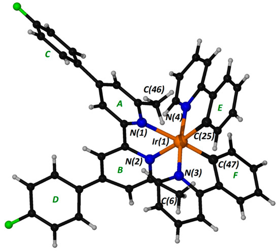 Data were collected from a few different crystals, but their quality did not allow the collection of a better data set. The crystals were opaque and appeared to lose their solvency. Some residual electron densities, assigned to solvent molecules, could not be modeled and were treated with the SQUEEZE routine implemented in PLATON. To confirm the assignment of the coordinated C and N atoms of the phenylpyridine molecules, several models were used in the refinement, spanning from simple C/N to N/C swap to different ppy molecules with partial occupancies coordinated in different positions. In all cases, the R values were increased, or several atoms came up with a non-positive definite.