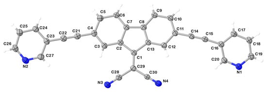 The multitopic ligand 1 was fully characterized by means of elemental analysis, ESI-MS, FT-IR, 1H, and 13C NMR spectroscopy. The middle infrared spectrum shows the characteristic peaks for the C≡N and C≡C stretching modes at 2225 and 2198 cm−1, respectively (Figure S1). The 1H NMR spectrum in CDCl3 (Figure S2) shows the H-pyridyl signals at 8.80, 8.59, 7.87, and 7.33 ppm, and those of the relevant protons of the fluoren-9-ylidene fragment at 8.55, 7.71, and 7.60 ppm. The 13C{1H} spectrum in the same solvent (Figure S3) shows a signal at 159.9 ppm assigned to the C−9 of the fluoren-9-ylidene moiety and three signals resonating at 91.5, 88.6, and 77.9 ppm ascribed to the alkyne and nitrile functionalities, respectively. The MS spectrum in MeCN is consistent with the chemical structure of compound 1 (Figure S4). Recrystallization of the crude product from chloroform yielded well-defined purple needle-shaped crystals, which were structurally characterized by SC-XRD analysis. Compound 1 crystallizes in the monoclinic space group P21/c with one molecule in the asymmetric unit featuring a periplanar conformation where the nitrogen atoms of both pyridyl rings face the same side of the malononitrile substituent (Figure 1) [7].