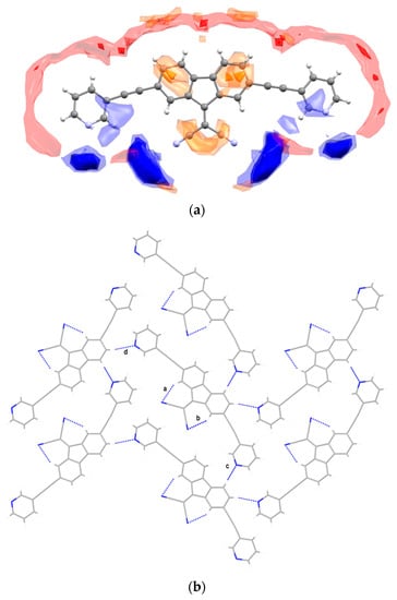The FIM indicates four main hydrogen bond acceptor sites (highlighted in blue) close to the heteroatoms and a diffuse hydrogen bond donor region (highlighted in red) with hotspots close to the aryl protons of both the pyridyl and fluorenyl moieties. In agreement with the knowledge-based predicted scenario, the crystal packing is characterized by multiple intermolecular CH∙∙∙N bonds between adjacent molecules of compound 1, generating wavy sheets parallel to the [0 1 0] direction (Figure 3; see interactions c–d in Figure 2b and Table 1).