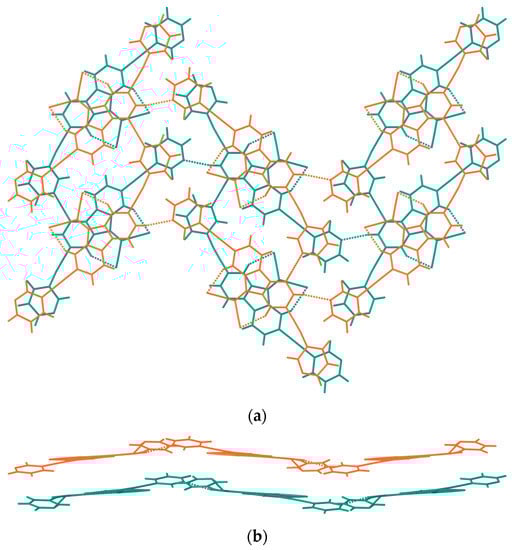Packing diagrams of compound 1 viewed along [1 0 0] and [1 0 1] directions in (a,b), respectively, showing corrugated sheets. Molecules from adjacent sheets are depicted in different colors. H-bonds are represented as dashed lines.