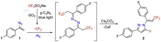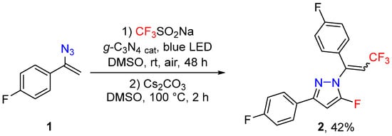 Previously unknown 3-(4-fluorophenyl)-1-(1-(4-fluorophenyl)-3,3,3-trifluoroprop-1-en-1-yl)-5-fluoro-1H-pyrazole (2) was obtained with a yield of 42% via a one-pot synthetic sequence, including g-C3N4-catalyzed heterogeneous photochemical trifluoromethylation of vinyl azide 1 with sodium trifluoromethanesulfinate as the CF3-radical source under visible-light irradiation and defluorinative cyclization of intermediate azine under basic conditions. The structure of the compound was confirmed by NMR spectroscopy, mass spectrometry, and IR analysis.