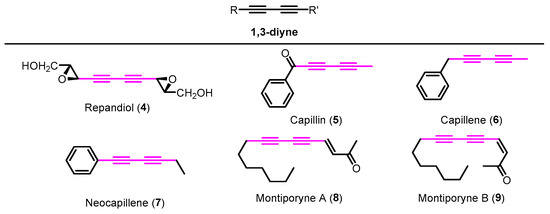 - Shi Shun, A.L.K.; Tykwinski, R.R. Synthesis of Naturally Occurring Polyynes. Angew. Chem. Int. Ed. 2006, 45, 1034–1057. [Google Scholar] [CrossRef] [PubMed]