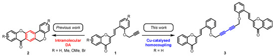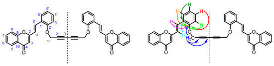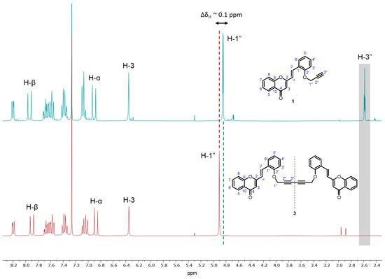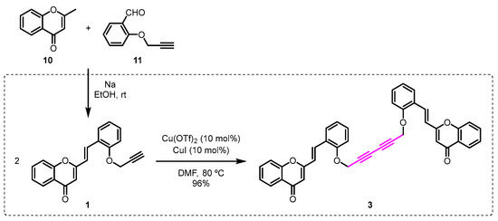 3.2. General Procedure for the Synthesis of 2,2’-[(1E,1’E)-{[Hexa-2,4-diyne-1,6-diylbis(oxy)]bis(2,1-phenylene)}bis(ethene-2,1-diyl)]bis(4H-chromen-4-one) (3)