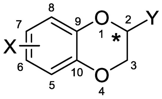 1,4-benzodioxane occurs as a key substructure in a variety of compounds, many of which exert biological activity and have therapeutic potential. Its applications in drug design, which range from antibacterial agents to cancer chemotherapics, adrenergic, serotoninergic and nicotinic receptor antagonists and agonists, and a variety of enzyme inhibitors, have been recently reviewed []. Mostly, the interaction capabilities of these molecules with biological targets are critically related to two structural features, namely the substitution at the benzodioxane C(2) and the decoration of the benzene ring with different substitution patterns (Figure 1), the former resulting in chirality and often in high eudismic ratios [] and the latter mainly translating into different selectivity profiles for receptor subtypes of the same family [,,].
