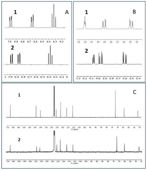 (A) Aromatic region and (B) aliphatic region of the 1H NMR spectra of 1 and 2 and (C) 13C NMR spectra of 1 and 2. (A) The three adjacent hydrogens of the benzene ring give an analogous sequence of signals: dd, dd and t (from low field to high field). (B) The three hydrogens of the dioxane portion give an analogous sequence of three dd. (C) The spectra are indistinguishable. All the spectra were registered in C6D6.
