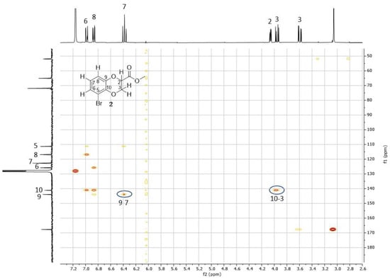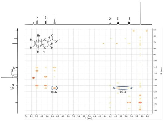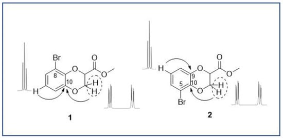 As a consequence of the identification by HMBC NMR, the difference in chemical shift of the proton para to bromine in the 1H NMR spectra (see Figure 3A) became diagnostic of the bromine position on the 1,4-benzodioxane nucleus: high-field H-5 in 8-brominated 1, low-field H-8 in 5-brominated 2.