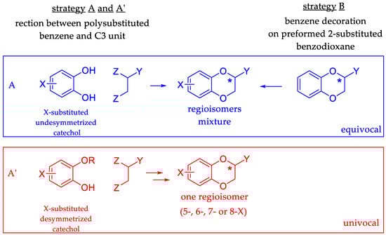Common issues of the two strategies are the production of positional isomers []. When applying the former approach, this problem can be bypassed by using differentially substituted desymmetrized catechols (strategy A’), such as ortho, meta and para substituted catechol monoethers, whose preparation and analytical characterization, however, is often laborious. A striking example is provided by the regioisomers of nitrocatechol monobenzyl ether [], mono O-MEM-protected 4-bromocatechol [] and 4-chlorocatechol monobenzyl ether [], used to prepare 2-substituted 1,4-benzodioxane bearing -NO2, -NH2, -Br and -Cl substituents at the aromatic ring as nicotinic ligands [,] and antibacterial agents []. Otherwise, when using substituted undesymmetrized catechols (strategy A) or functionalizing preformed 2-substituted 1,4-benzodioxane at the benzene ring (strategy B), two or more positional isomers must be foreseen as products, whose unequivocal identification can be more difficult than their separation. Nevertheless, such synthetic approaches (strategies A and B) are attractive for a greater straightforwardness than strategy A’.