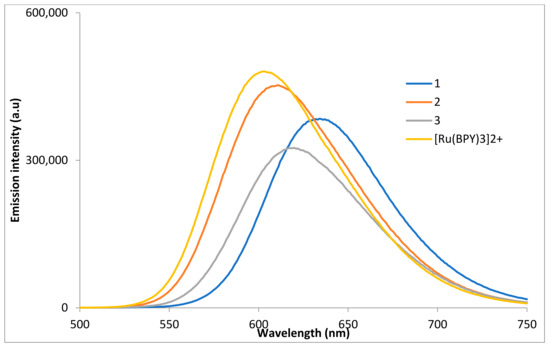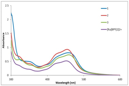 UV/Visible absorption data were collected for 1, 2, and 3 using a 5 × 10−5 molar solution in water (Figure 2). The observed absorbance bands were like those seen for [Ru(bpy)3]2+ in water. Several intense transitions in the wavelength range from 240 to 300 nm are assigned to π-π* transitions. The electronic transitions that appear at wavelengths higher than 300 nm in [Ru(bpy)3]2+ result from many overlapping MLCT bands from the metal-centered d-orbitals to the ligand π* orbitals and are, therefore, assigned similarly for 13. The lowest energy MLCT transition observed for compounds 13 occurs at λmax = ~460 nm, which are like the corresponding MLCT transitions in [Ru(bpy)3]2+max = 451 nm). Compound 1’s MLCT band is slightly more red-shifted than compounds 2 and 3 due to the electron-withdrawing –COOH group.