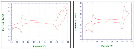 It is important to know the details of the redox process of Ru3+/2+ to understand the redox chemistry of the ruthenium complexes 13, which is presented in Figures S7–S9. The redox chemistry of complexes 13 in CH3CN is presented in Table 3 as compared with Ru(bpy)32+. The cyclic voltammogram of Ru(bpy)32+ corresponds to the reversible one metal-based Ru3+/2+ oxidation process and three one-electron BPY-based reduction processes [11]. We observe similar redox chemistry for all complexes; however, in compound 3, the three one-electron reduction processes are merged together into a single broad peak at −1.34 V, as shown in Figure 4, which is due to the effect of the substituent in the bipyridine unit.