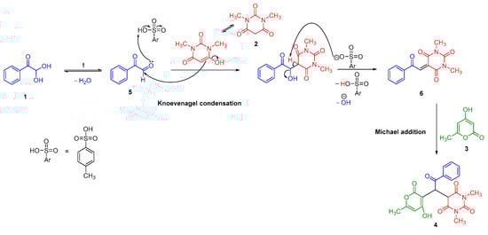 We did not detect any intermediates during the reaction, so the mechanism was proposed based on the pKa values of C-H acids 2 and 3. 1,3-Dimethylbarbituric acid (2) (pKa 4.68 [21]) has a lower pKa value than 4-hydroxy-6-methyl-2H-pyran-2-one (3) (pKa 6.83 [22]), so it is a stronger acid and reacts with the carbonyl compound 1 first.