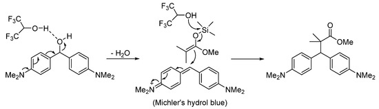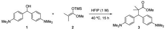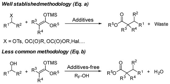 - Pérez, J.M.; Maquilón, C.; Ramón, D.J.; Baeza, A. Hexafluoroisopropanol-Promoted Metal-Free Allylation of Silyl Enol Ethers with Allylic Alcohols. Asian J. Org. Chem. 2017, 6, 1440–1444. [Google Scholar] [CrossRef]