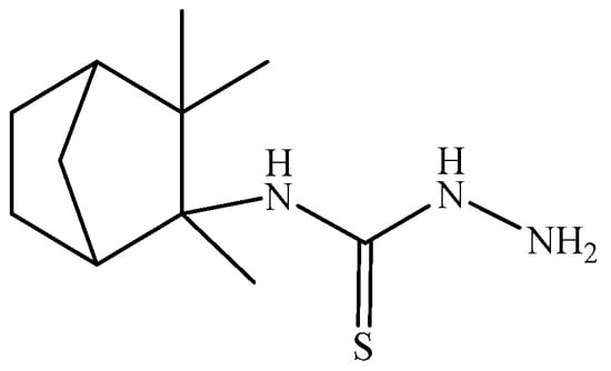 The relevance of expanding the library of modified monoterpene compounds is associated with their diverse biological activity. For example, camphene derivatives alleviate oxidative stress, reduce skeletal muscle atrophy [], and exhibit antibacterial [], anti-inflammatory [], antioxidant [] and antiviral activity []. Camphene derivatives show insecticidal properties []. Thiosemicarbazide derivatives of camphene significantly increase antifungal activity compared to unsubstituted thiosemicarbazide (Figure 1) []. Microorganisms’ and viruses’ resistance to drugs is a growing concern that poses a challenge for chemists to search for synthesis methods of new biocompatible substances, so the modification of terpenes is an urgent task.