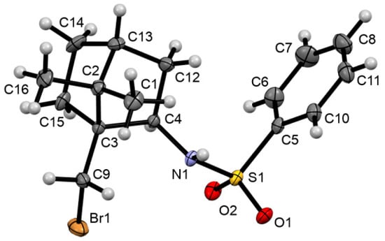 The structure and composition of the resulting products were established with NMR, IR spectroscopy, high resolution mass spectrometry (HRMS) and elemental analysis data. The 1H NMR spectrum of compound 3 displayed the doublet of the NH group, and CH2Br doublets at 3.47 and 3.34 ppm with J = 10.5 Hz (Figure S3). The 13C NMR spectrum contained signals of the carbon atom CHN: CH2Br and CH3 groups at 59, 38 and 20 ppm, respectively (Figure S4). The IR spectrum of compound 3 showed bands at νNH = 3289 cm−1 and νSO2 = 1322 cm−1. Structure 3 was proved by X-ray analysis (Figure 2, Tables S1 and S2). Compound 4 had the following structure of 3-(bromomethylene)-2,2-dimethylbicyclo[2.2.1]heptane according to the presence in the 1H NMR spectrum of a signal at 5.62 ppm, which had 1H-13C satellites with 1JCH = 196.12 Hz, which proved the presence of the =CHBr group (Figures S5 and S6). In reference [], the preparation of compound 4 under similar conditions in the absence of benzenesulfonamide was described.