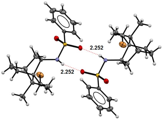 The single crystals of compound 3 were obtained through re-crystallization from a chloroform solution. Molecules of compound 3 crystallized in monoclinic space group C2/c in the crystal molecules of 3 connected by intermolecular hydrogen bonds NH···O=S by lengths 2.252 Å (Figure 3).