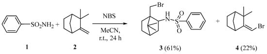The reaction of benzenesulfonamide 1 and camphene 2 was carried out in acetonitrile in the presence of N-bromosuccinimide at room temperature. The reaction led to the formation of two products: N-(1-(bromomethyl)-7,7-dimethylbicyclo[2.2.1]heptan-2-yl)benzenesulfonamide 3 with good yield and 3-(bromomethylene)-2,2-dimethylbicyclo[2.2.1]heptane 4 as a minor product (Scheme 1).