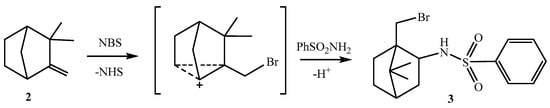 The first step of the reaction was the attack of the bromine cation by NBS at the terminal carbon atom of the camphene 1 C=C bond. The next step was accompanied by Wagner–Meerwein rearrangement, followed by the attack of sulfonamide 1 to form the final structure 3 (Scheme 2):