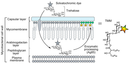 Simplified representation of the mycobacterial cell wall, illustrating the conversion of dye trehalose conjugates to the corresponding trehalose monomycolates (TMM, chemical diagram on the right) and insertion into the mycomembrane. The figure was adapted from Ref. [5]. Published Open Access under the Creative Commons Attribution 4.0 International License (https://creativecommons.org/licenses/by/4.0/ (accessed on 23 April 2023)). Copyright 2021 The Authors.
