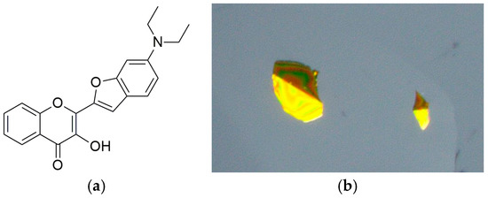 Compound 3HC-2 (Figure 3a) was synthesized as described in the literature [5]. In brief, 2′-hydroxyacetophenone was reacted with 6-(diethylamino)benzofuran-2-carbaldehyde [16], followed by treatment with hydrogen peroxide to give the desired 3-hydroxychromone derivative 3HC-2. Intense yellow crystals of 3HC-2, as shown in Figure 3b, grew from a solution in heptane/ethyl acetate. X-ray crystallography revealed that the compound crystallized solvent-free in the triclinic system, centrosymmetric space group P-1, with two molecules in the unit cell (Z = 2).
