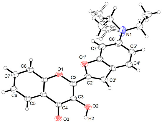 The crystal structure was solved with SHELXT [37] and refined with SHELXL-2019/3 [38]. Anisotropic atomic displacement parameters (ADPs) were introduced for all non-hydrogen atoms. The diethylamino group was affected by positional disorder, which was taken into account by a split model for one ethyl group. Refinement of the ratio of occupancies by means of a free variable resulted in 0.531(4):0.469(4). Similar distance (SADI) and enhanced rigid-bond restraints (RIGU) [39] were applied to the disordered ethyl group. Except for the hydroxy hydrogen atom H2 and H3′ on the benzofuran moiety, hydrogen atoms were placed in geometrically calculated positions with Caromat–H = 0.95 Å, Cmethylene–H = 0.99 Å, and Cmethyl–H = 0.98 Å and refined using a riding model with Uiso(H) = 1.2 Ueq(C) (1.5 for methyl groups). The initial torsion angle of the methyl group of C10 was determined in a circular Fourier calculation and subsequently refined while maintaining a tetrahedral structure. H2 and H3′ were located in difference Fourier maps and refined with the O2–H2 and C3′–H3′ distance restrained to target values of 0.84(2) and 0.95(2) Å, respectively, and with Uiso(H) = 1.2 Ueq(C, O). Crystal data and refinement details are listed in Table 2. Structure pictures were drawn with Diamond [40]. Hirshfeld surface analysis was carried out using CrystalExplorer [41].