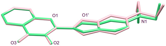 Structure overlay of the 3-hydroxychromone moieties of the molecular structure of the major disorder part structure (green) and DFT-optimized structure (pink) of the free molecule of 3HC-2.