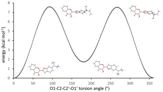 A CSD search (April 2023) for crystal structures containing a 2,3-diether-butadiene moiety with a central acyclic C-C single bond revealed 107 entries. Of these, 80 structures exhibited an O–C–C–O torsion angle between 163 and −164°, and for 21 structures the O–C–C–O torsion angle was between −26 and 20°, as observed for 3HC-2. Intermediate torsion angle values in six structures can likely be attributed to packing effects or the steric bulk of substituents (NENLAT −60.2° [24], AHAYEO −47.3° [25], CIVXUC 37.9° [26], SILXAP 49.5° [27], HEJRUL 76.3° [28], DADHOJ 127.2° [29]). The relatively small number of structures with an O–C–C–O torsion angle around 0° prompted us to calculate the optimized structure of the free molecule of 3HC-2 using DFT methods. The minimum energy structure of the free molecule exhibited an O1–C2–C2′–O1′ torsion angle of 0°. Figure 5 shows a superposition of the 3-hydroxychromone moieties of the molecular structure in the crystal and the DFT-optimized molecular structure of the free molecule of 3HC-2, illustrating the conformational difference between the two structures, which can be attributed to packing effects in the crystal (vide infra). A relaxed surface scan was subsequently calculated in order to explore the conformational flexibility of 3HC-2 about the central C2–C2′ bond. This revealed a rotational barrier of ca. 7.5 kcal mol−1 and the energy of the s-trans conformer was about 1.8 kcal mol−1 higher than that of the local ground state structure adopting the s-cis conformation (Figure 6).