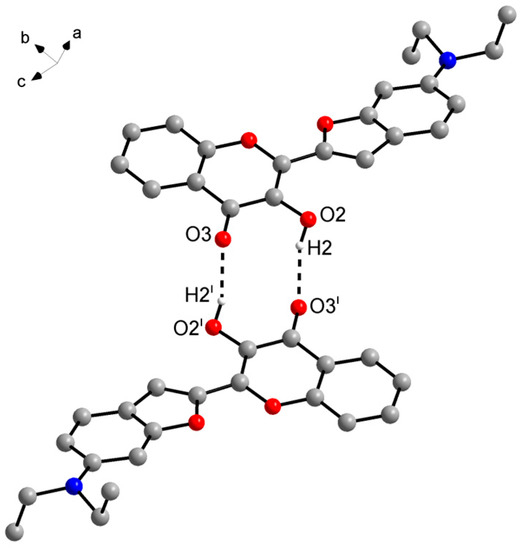Figure 4 shows the molecular structure of 3HC-2 in the crystal. One of the ethyl groups exhibits disorder over two positions. As expected, the ten-membered chromene system is planar (r.m.s. deviation 0.0108 Å) as is the nine-membered benzofuran moiety tethered to C2 (r.m.s. deviation 0.0107 Å). The molecule adopts an s-cis conformation about the C2–C2′ bond. The O1–C2–C2′–O1′ torsion angle is −13.76(16)° in the chosen asymmetric unit, and the angle between the mean planes through the chromene and benzofuran moieties is 14.42(4)°. An s-cis conformation was encountered in the related 3-(furan-2-yl)-2-hydroxy-4H-chromen-4-one (CSD refcodes: IJUCEW and IJUCEW01) [19,20] and its nicotinic acid ester (MASGAS) [21]. Interestingly, an s-trans conformation was found in the crystal structures of the 2-thiophenyl derivatives ((5-(3-hydroxy-4-oxo-4H-chromen-2-yl)-2-thienyl)methylene)malononitrile (MUGGEC) [22] and 2-(thiophen-2-yl)-4H-chromen-4-one-3-O-2,3,4,6-O-tetraacetyl-β-d-glucopyranoside (QICLIA) [23].