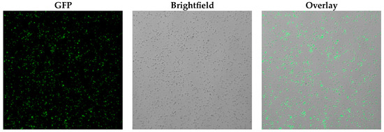 After incubation (see Section 3.4), the contents of the wells were homogenized by pipetting and 1 µL of each well was transferred to a black clear flat-bottom 96-well plate (Greiner bio one, 6550909) filled with 200 µL phosphate-buffered saline per well. Fluorescence microcopy was performed with a Thermo Scientific (Waltham, MA, USA) CellInsight CX5 instrument. Samples were excited at 485 nm and imaged with the GFP channel (510–531 nm).
