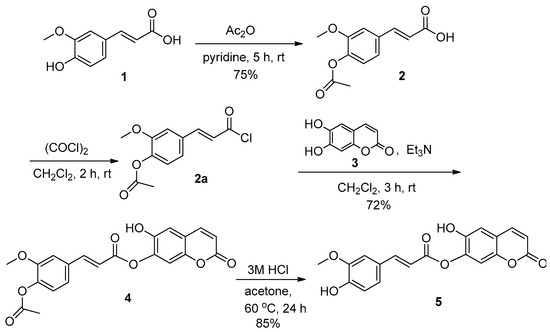 The new compound 5 was prepared as shown in Scheme 1. The hydroxy group of the starting material 1 was first protected with acetic anhydride and pyridine according to the previously reported procedure [19] to give 2, (E)-3-(4-acetoxy-3-methoxyphenyl)- acrylic acid. After 2 was activated with oxalyl chloride, including DMF, the resultant 2a was allowed to react with 3 in dichloromethane at room temperature for 3 h in the presence of triethylamine to afford an esterified product 4, (E)-6-hydroxy-2-oxo-2H-chromen-7-yl 3-(4-acetoxy-3-methoxyphenyl)acrylate at a 72% yield. The deprotection of the acetyl group of 4 was achieved through the use of a 3M HCl solution in acetone at room temperature for 24 h to give a conjugate compound 5 in an 85% yield.