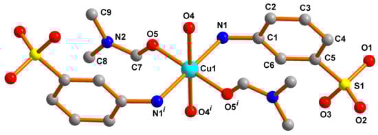 An idealized ball and stick presentation of the crystal structure of the bis(3-aminobenzenesulfonato-κN)diaquabis(dimethylformamide-κO)copper(II) complex [Cu(L1)2(DMF)2(H2O)2] (1) is depicted in Figure 1, while their selected bond lengths and angles are listed in Table S1 (Supplementary Materials). Crystal structure analysis shows that it is a mononuclear copper(II) complex containing a Cu(II) center connected by trans-directed two 3-aminobenzenesulfonate ligands (L1− = 3-aminobenzenesulfonate), two water and two dimethylformamide (DMF) solvent molecules. The crystal structure is symmetric due to the presence of an inversion center. Comparison of the crystal structure with that of the reported copper(II) complex [Cu(L2)2(DMF)2(H2O)2] (2) (HL2 = 4-aminobenzenesulfonic acid) (Chart S1, Supplementary Materials) [23] reveals an interesting aspect that compounds 1 and 2 have same empirical formula (C18H30CuN4O10S2) with isomeric ligands (3-aminobenzenesulfonic acid in 1 and 4-aminobenzenesulfonic acid in 2) and the same numbers of water (two) and DMF (two) molecules, presenting them as isomers.