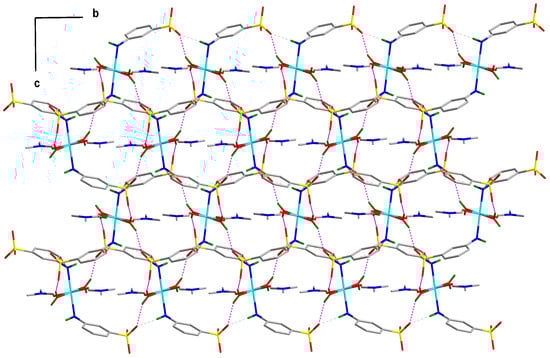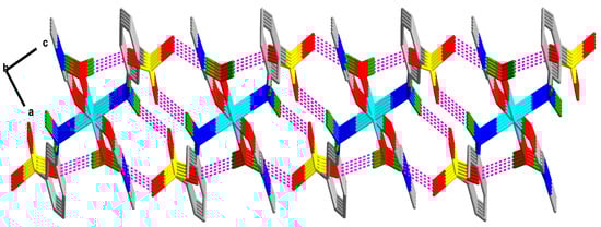 The crystal structure (Figure S1, Supplementary Materials) of 2 also contains four H-bonding interactions involving water and amine as donors and noncoordinated sulfonate as acceptor. However, co-existence of these four non-covalent interactions leads to the formation of a 3D supramolecular structure (Figure S2) unlike to the 2D motif in 1. Comparison among the geometrical parameters of H-bonds (Table S2, Supplementary Materials) in 1 and 2 demonstrates that H-bonds involving water molecules are slightly longer in 2. These longer water-sulfonate noncovalent H-bonds along with the longer metal–water covalent bonds in 2 could be the major contributing factors for the formation of the 3D network in 2, in contrast to the 2D in 1.