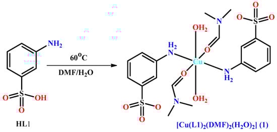 Aminobenzenesulfonic acid [18,19,20,21,22,23,24,25,26,27,28] is a bifunctional species with three structural isomeric forms; ortho (2-amino) [18,19], meta (3-amino) [20,21,22] or para (4-amino) [23,24,25,26,27]. These isomeric forms and their derivatives are known for H-bond interactions via non-coordinated sulfonate oxygens but their different types of coordination mode to produce versatile molecular structure are not fully explored. 2-aminobenzenesulfonic acid was mainly converted to a Schiff base and further utilized to derive metal complexes [19] while 4-aminobenzenesulfonic acid was directly reacted with metal salts, producing either amine coordinated mononuclear or both amine and sulfonate coordinated polymeric species [23,24,25,26,27]. The other isomer 3-aminobenzenesulfonic acid has not been frequently used to synthesize metal complexes [20,21,22]. With the possibility to obtain a new compound with attractive molecular and supramolecular structures, we reacted 3-aminobenzenesulfonic acid (HL1) with Cu(NO3)2·2.5H2O and obtained the new bis(3-aminobenzenesulfonato-κN)-diaqua-bis(dimethylformamide-κO)-copper(II) complex [Cu(L1)2(DMF)2(H2O)2] (1) (Scheme 1). Herein, we report the synthesis, molecular and supramolecular structure of this mononuclear complex. Its relevant structural features (supramolecular structure and topology) are compared with that of the known bis(4-aminobenzenesulfonato-κN)diaquabis(dimethylformamide-κO)copper(II) complex (2) [Cu(L2)2(DMF)2(H2O)2] (HL2 = 4-aminobenzenesulfonic acid) (Chart S1, Supplementary Materials) [23].