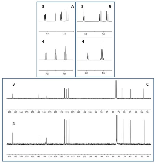 Aromatic region (A) and aliphatic region (B) of the 1H NMR spectra of 3 and 4 and 13C NMR spectra of 3 and 4 (C). (A) The three adjacent hydrogens of the benzene ring give an analogous sequence of signals: dd, dd and t (from low field to high field). (B) The three hydrogens of the dioxane portion give an analogous sequence of a pseudo triplet and two double doublets or three double doublets. (C) The spectra are indistinguishable. All the spectra were registered in CDCl3.