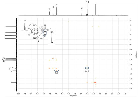 HMBC spectrum of 4 displaying important correlations between C(9) and H(7) and between C(10) and H(3).