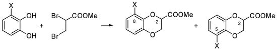 Synthesis of 8- and 5-X substituted methyl 1,4-benzodioxane-2-carboxylates from 3-X substituted catechol and methyl 2,3-dibromopropionate.