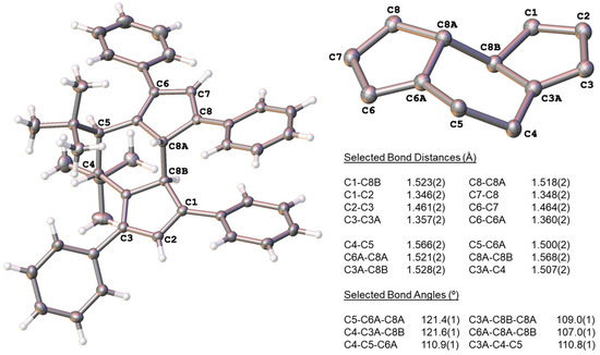 Exposure of yellow-colored and rapidly stirred MeCN solutions of the dicyclopentadienyl dipotassium salt complex ansa-[(CHBut)2(Ph2C5H2)2]K2(THF)3 1 [8] to pure O2 (1 atm) resulted in a rapid color change to an intense green with the deposition of a white solid within 2 min. With continued stirring over 17 hrs, the intense green color faded to a dark brown with lighter colored solids in the reaction mixture. Isolation of 2 from the reaction mixture was carried out by filtration of the light-brown-colored solids, followed by extraction of the solids with toluene under N2. Removal of toluene from the extract under vacuum left 4,5-di-tert-butyl-1,3,6,8-tetraphenyl-4,5,8a,8b-tetrahydro-as-indacene 2 as an off-white crude solid product in a 73% yield (Scheme 1). The 1H NMR spectrum of crude 2 showed the exclusive formation of one product with well-resolved PhH resonances, a pair of sharp singlet peaks for the tetrahydro-as-indacene core protons CHBut and CHC (2 H each, δ 3.31 and 3.66), one singlet peak for two cyclopentadienyl ring H’s (2H, δ 6.95), and one peak for the But group (18H, δ 0.87) and revealed the C2-symmetric structure of 2. The extraction of 2 into toluene left an orange-colored solid by-product trapped in celite. The by-product was identified as KO2 contaminated with unidentified organics due to the observed reactivity of the by-product with water, its paramagnetism, and comparison of the FTIR spectrum of the by-product to an authentic sample of KO2 (Figures S6 and S7, Supplementary Materials). Based upon the identification of KO2 in the by-product, we suggest that this reaction proceeds via a bridged diradical (bis)superoxo intermediate (1A, Scheme 1). The intermediate 1A forms by dioxygen-mediated one-electron oxidations of each of the diphenyl cyclopentadienyl rings, and subsequently collapses to the product 2 by loss of KO2 and radical coupling between the rings (Scheme 1). A single-crystal X-ray diffraction study of 2 was carried out (Figures S13–S19, Tables S1–S6, Supplementary Materials) and revealed the tetrahydro-as-indacene structure resulting from the formation of a new C-C bond (Figure 1, C8A-C8B 1.568(2) Å) between the two formerly 1,3-diphenylcyclopentadienyl radicals of intermediate 1A (Scheme 1). Each resulting diphenylcyclopentadiene ring is fused to a central six-membered ring locked into a chair conformation via double bonds at C3A (C3-C3A 1.357(2) Å) and C6A (C6-C6A 1.360(2) Å) and single bonds at C8B (C1-C8B 1.523(2) Å) and C8A (C8-C8A 1.518(2) Å) (Figure 1). The trigonal planar bond angles around C3A and C6A as well as the tetrahedral angles around C4, C5, C8A, and C8B are consistent with those expected for a tetrahydro-as-indacene core (Figure 1). Crystalline 2 obtained from both iPrOH and 2-butanol exhibits ambient light fluorescence and obvious green fluorescence under long-wave UV light (Figures S3 and S4, Supplementary Materials). Although the color of the ambient light fluorescence of 2 obtained from iPrOH and 2 obtained from 2-butanol appears slightly different (Figures S3 and S4, Supplementary Materials), a separate single-crystal X-ray diffraction study of a crystal of 2 grown from 2-butanol (Figure S23 and Table S7, Supplementary Materials) showed the same structure as the crystal obtained from iPrOH (vide infra), with no changes in molecular parameters or packing arrangement (Figures S20–S22, Supplementary Materials). The crystal structure data indicates that differences in ambient light fluorescence between crystalline 2 obtained from iPrOH compared to 2-butanol are not due to the solid-state molecular structure or packing effects, but more likely due to differences in crystallite size in the bulk samples. Thermal analysis of crystalline 2 (from iPrOH) gave SDT and DSC thermograms that showed an exotherm (onset 189.72 °C) followed by a melting transition (257.91 °C) and decomposition (Figures S8 and S9, Supplementary Materials). Visual inspection of the residue in the DSC pan after controlled pyrolysis to 220 °C showed a color change to yellow. Analysis of the yellow residue by 1H NMR (CDCl3) showed the presence of a small amount of unreacted 2 along with more significant peaks in chemical shift regions consistent with the conversion of 2, presumably via Diels–Alder chemistry (Figures S10 and S11, Supplementary Materials). More detailed investigations of the photophysical and thermal properties of 2 as well as the chemistry of 2 as a ligand for bimetallic complexes are the subject of ongoing research in our lab.